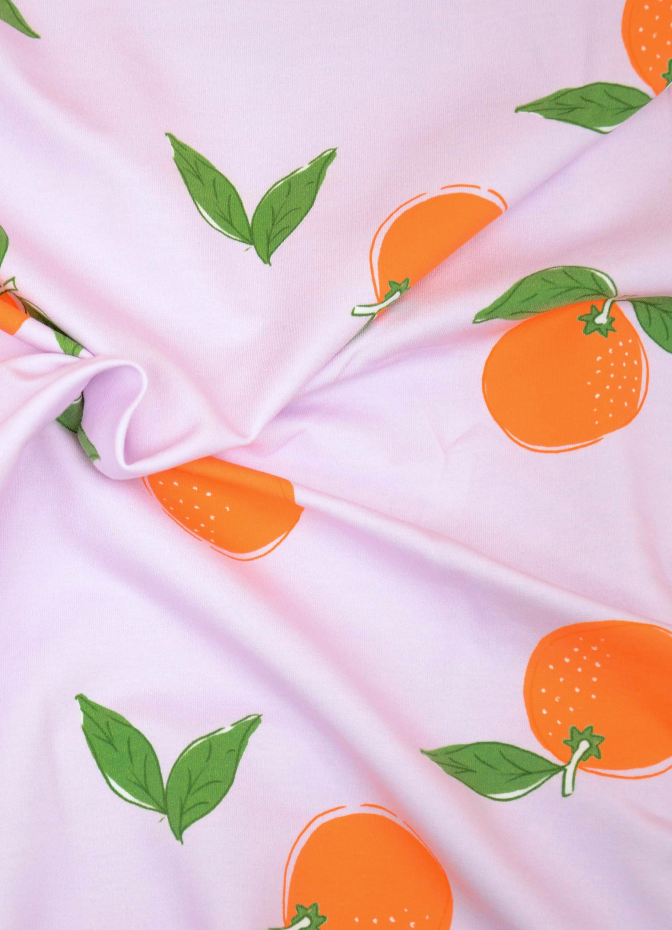 French Terry Hilco Frutta Mandarinen – Fruchtiges Design auf zartem Rosa