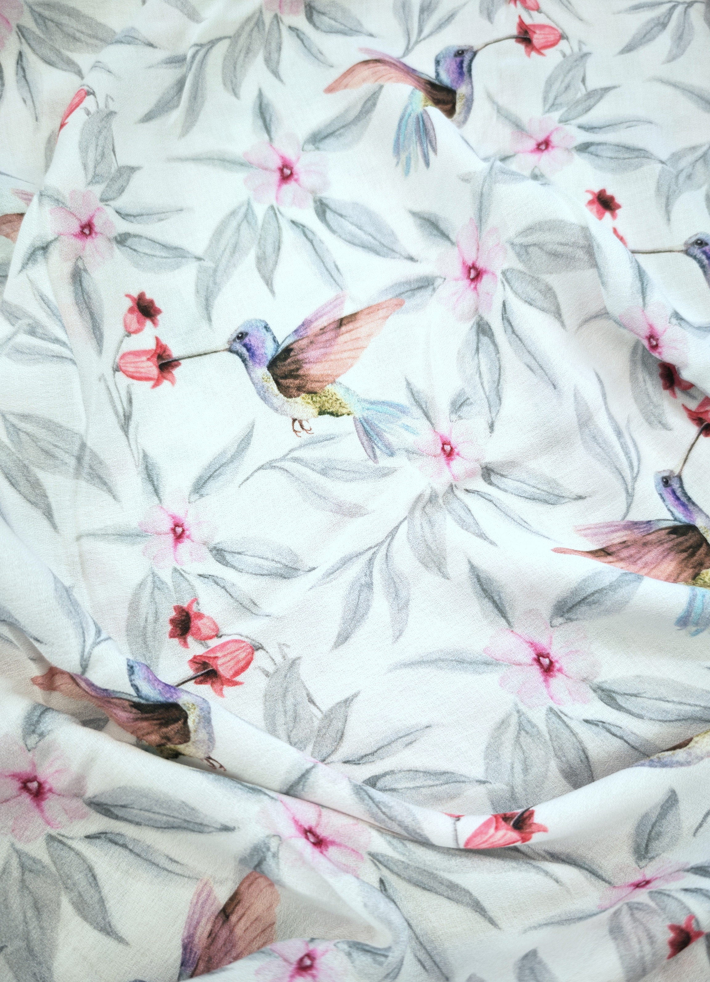 Viskose Webware mit zarten Blüten und Kolibris. Herrlich weich und fluffig.