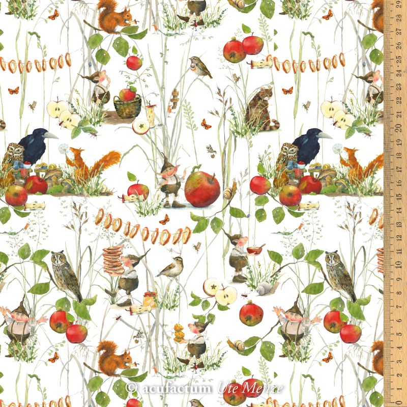 Einen feinen Tag auf der Fallobstwiese verlebt Bertie Pom mit seinen tierischen Freunden. Ein wunderschöner Kombinationsstoff ist das Design Apfelernte Art.-Nr. 3523-810