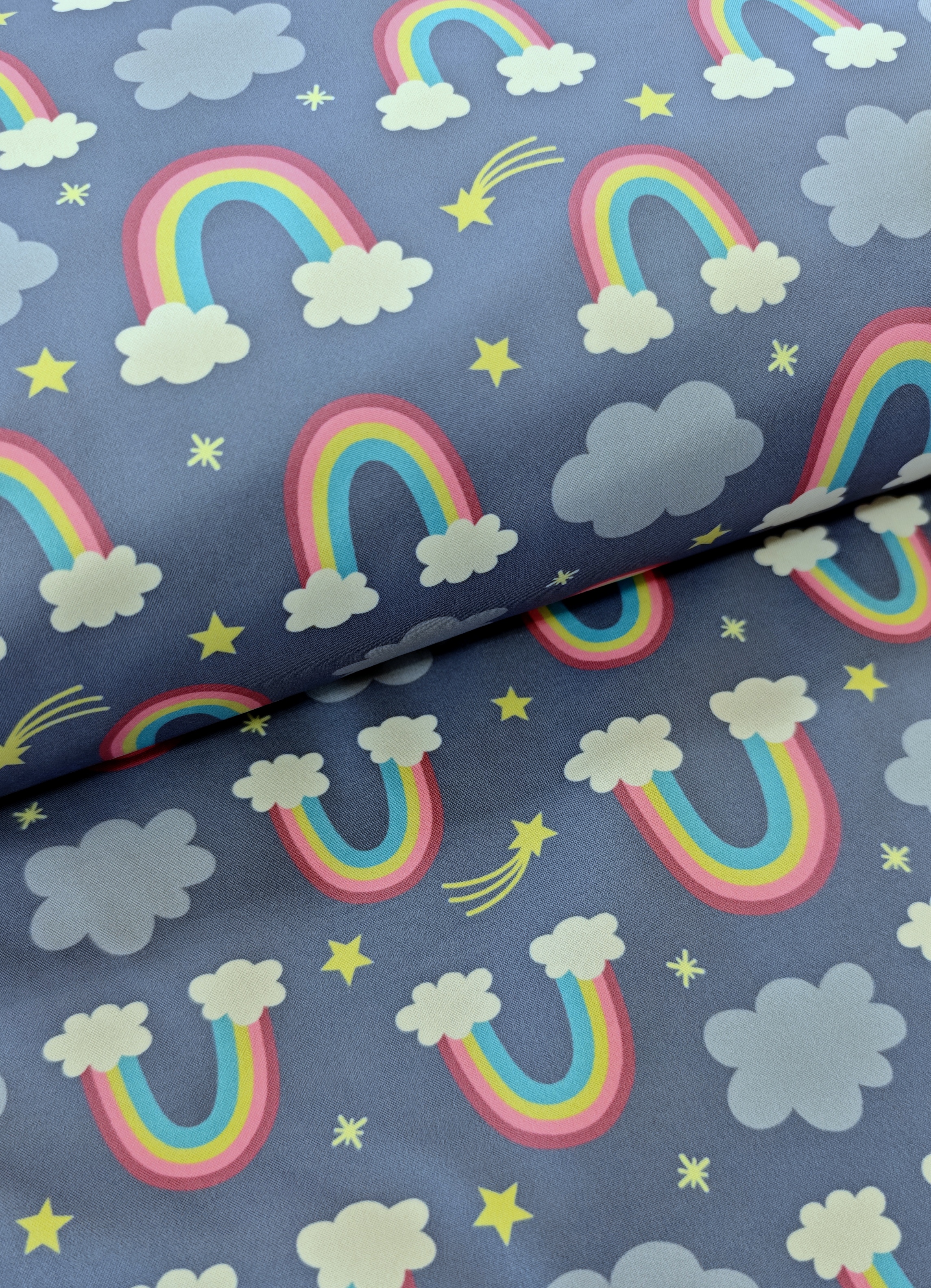 Softshell mit bunten Regenbögen auf rauchblau. Prinzessin Phantasie von Sandra Kretzmann Für Jacken und Taschen.