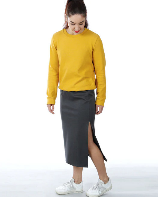 FRAU IRMA ist ein blitzschnell genähter, schlanker Bleistiftrock. Ein langer Schlitz in der Seitennaht garantiert die volle Bewegungsfreiheit. Die Midilänge passt zu Boots oder Sneakern genauso gut wie zu Sandalen oder High Heels. Ein unkomplizierter Rock für viele Gelegenheiten!