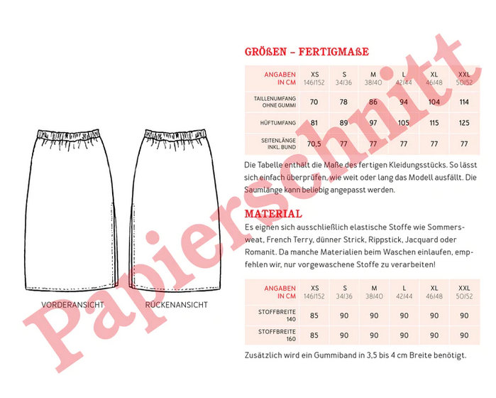 - Materialempfehlung: ausschließlich elastische Stoffe wie Sommersweat, French Terry, Strick, Rippstick, Jacquard oder Romanit